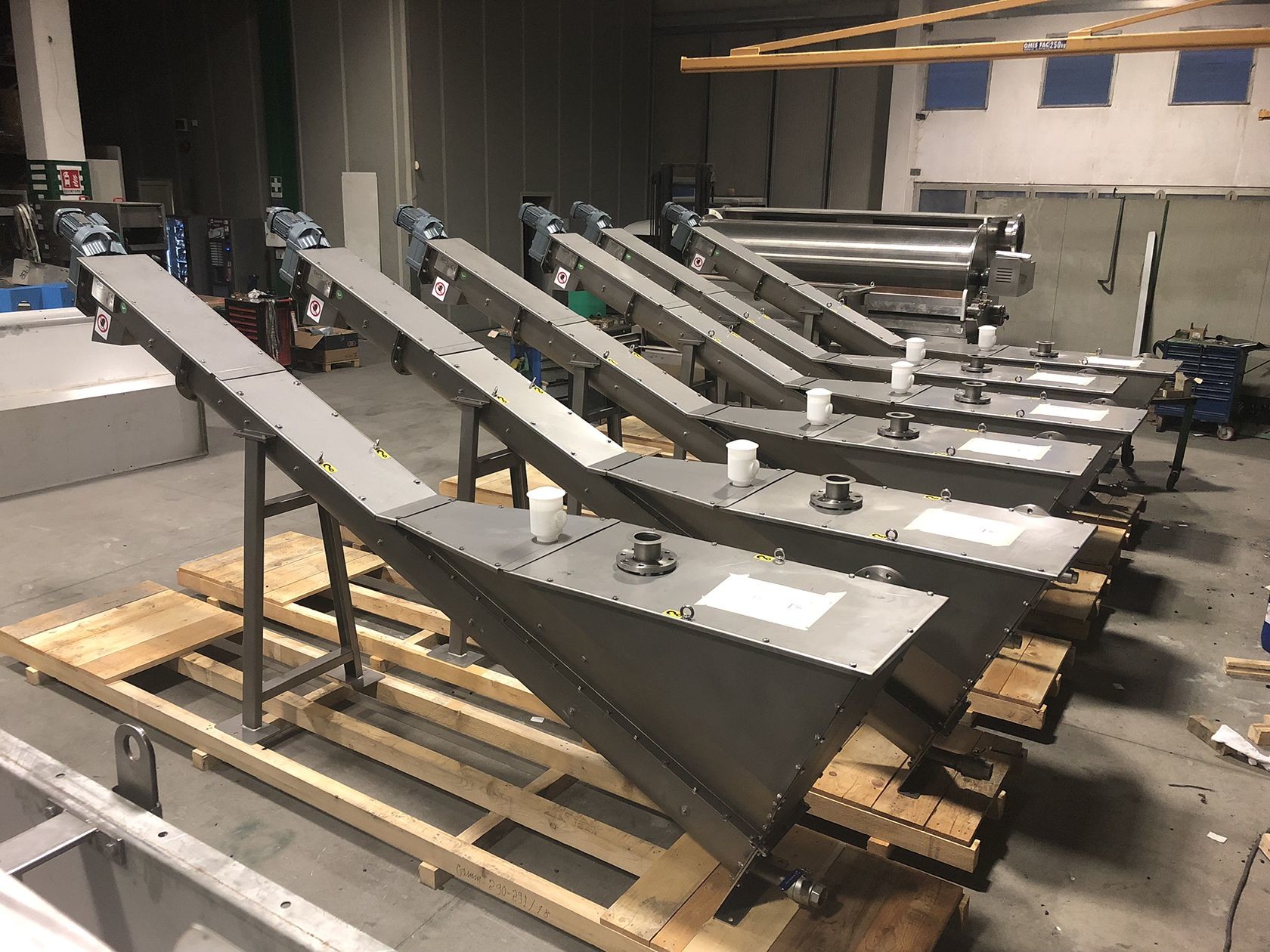 The clean water comes out of the hopper thanks to an overflow system linked to a flanged outlet. The low rotational speed and the special anti-wear covering fixed on the transport section assure an high efficiency and a low wearing of the machine’s internal parts.